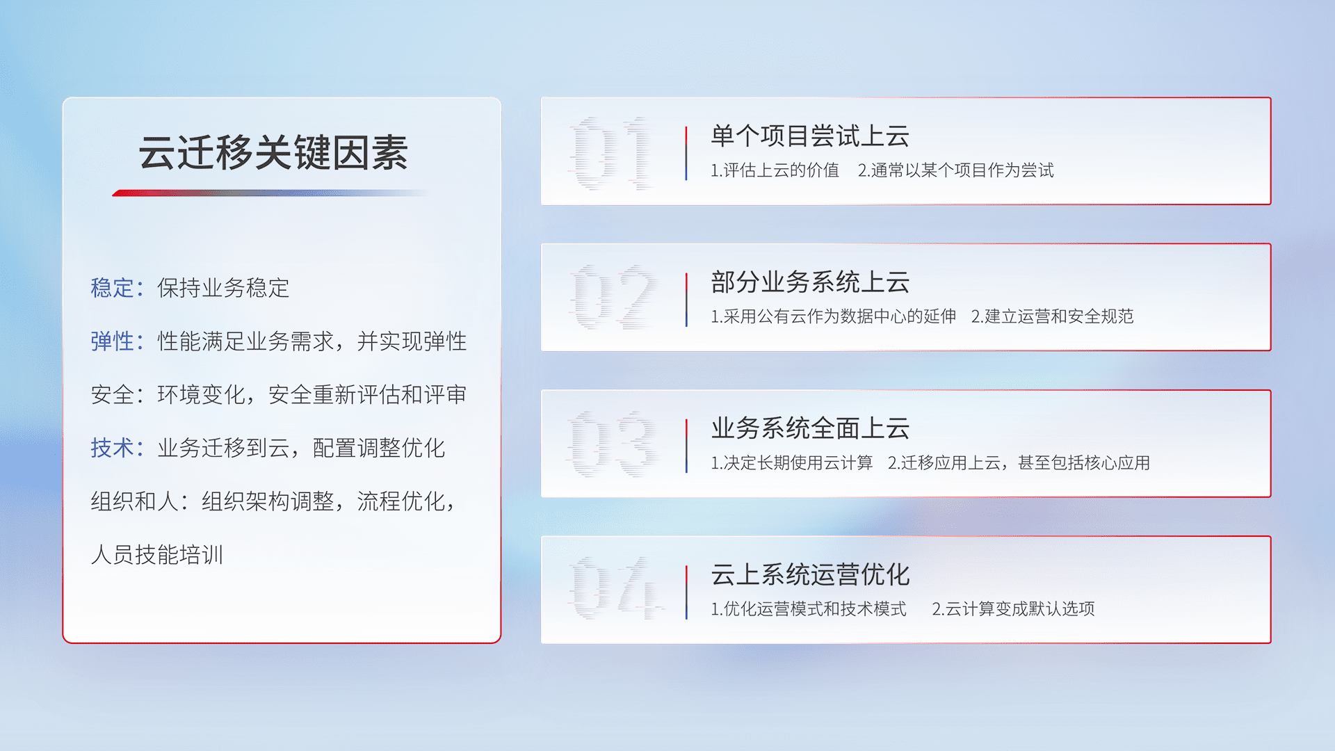 结合实际业务,,,,从规划设计、、云平台选型、、、、云原生改造、、数据迁移、、、集成交付,,,,迁移全过程为客户识别最佳上云路径,,做好风险识别管理,,设计网络架构、、、、身份权限、、、安全审计合规、、操作审计、、、日志审计、、、监控告警策略、、、多站点容灾设计等,,,,对云上基础设施进行整体规划,,,提升IT治理水平,,,,以满足弹性、、高可用、、、、高性能的需求。。